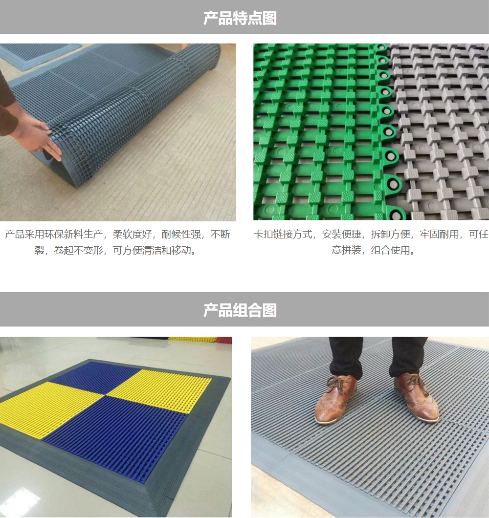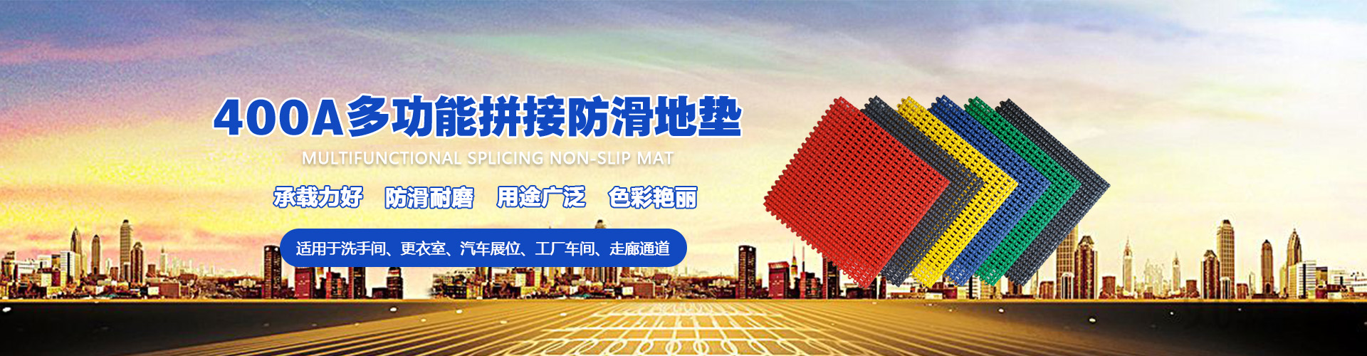 特点: 400A多功能拼接防滑地垫,采用优质PVC材料,无毒、无味、环保、健康。产品质量和要求符合GB18586-2001标准。具有色彩艳丽,美观大方,柔软度好,承重力强,安装方便的优点。广泛适用于,洗手间、淋浴房、汽车展位,车间地面、走廊通道,起到疏水、防滑、清洁、安全、保护地面的作用。
